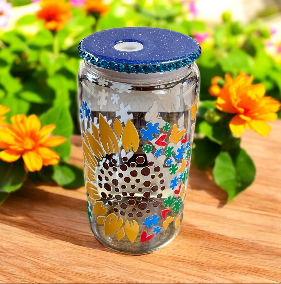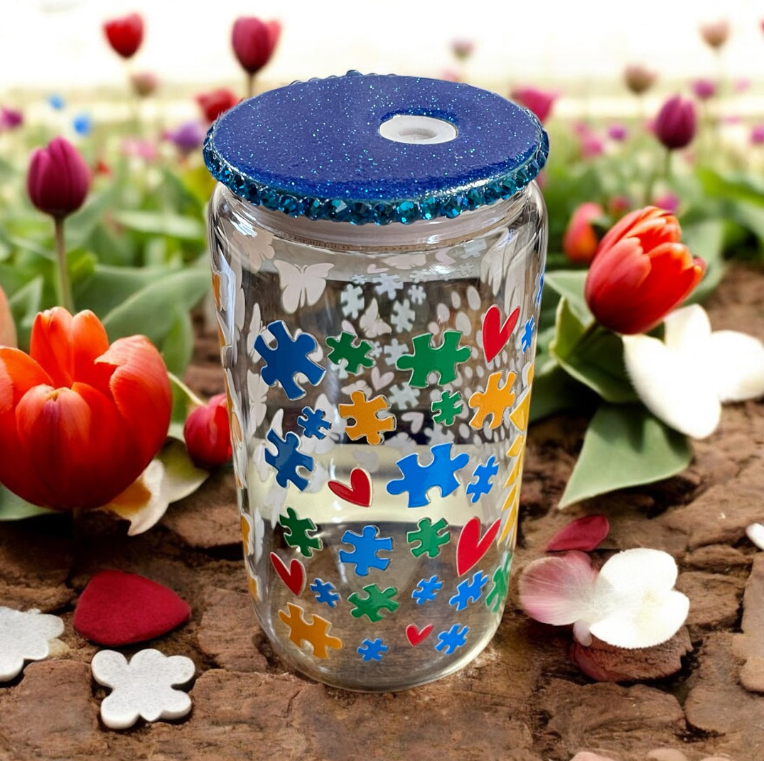 This glass tumbler comes with a wooden lid and a glass straw, ideal for sipping a cool piña colada on a warm summer afternoon or indulging in a refined café latte, all while promoting autism awareness. Each tumbler is crafted by hand, so minor imperfections may be present. Every effort is made to ensure consistency and alignment. Tumblers with slight visible flaws are offered at a reduced price. Please note that all sales are final, with no refunds or returns accepted.