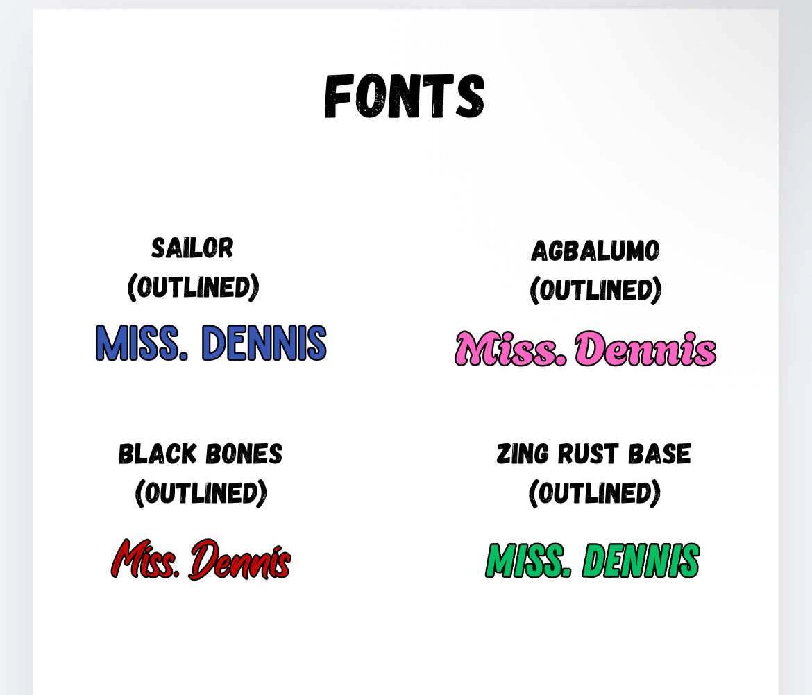 - Font style and color (e.g., Sailor, Pink)
